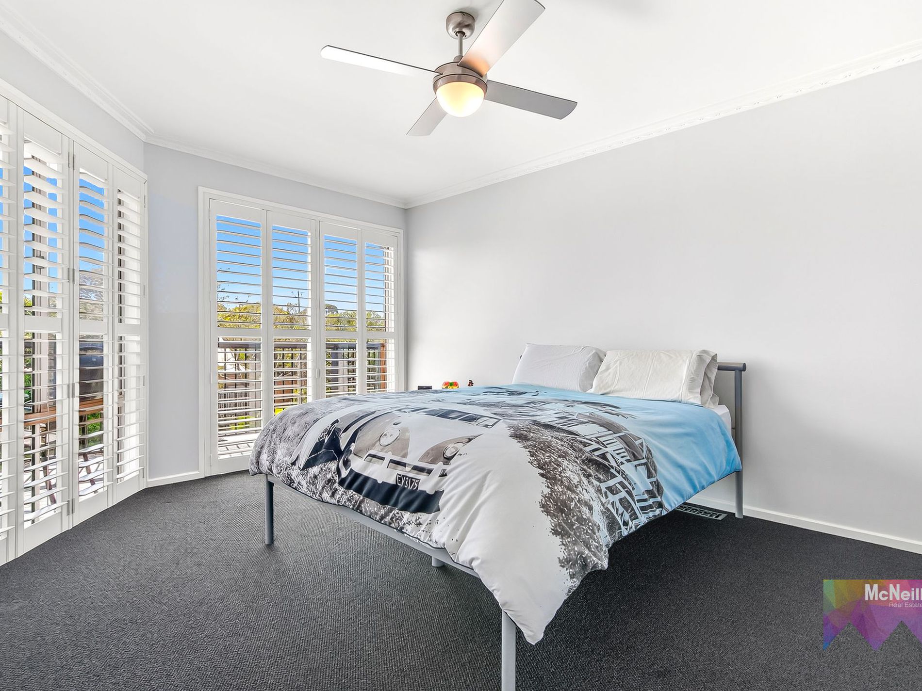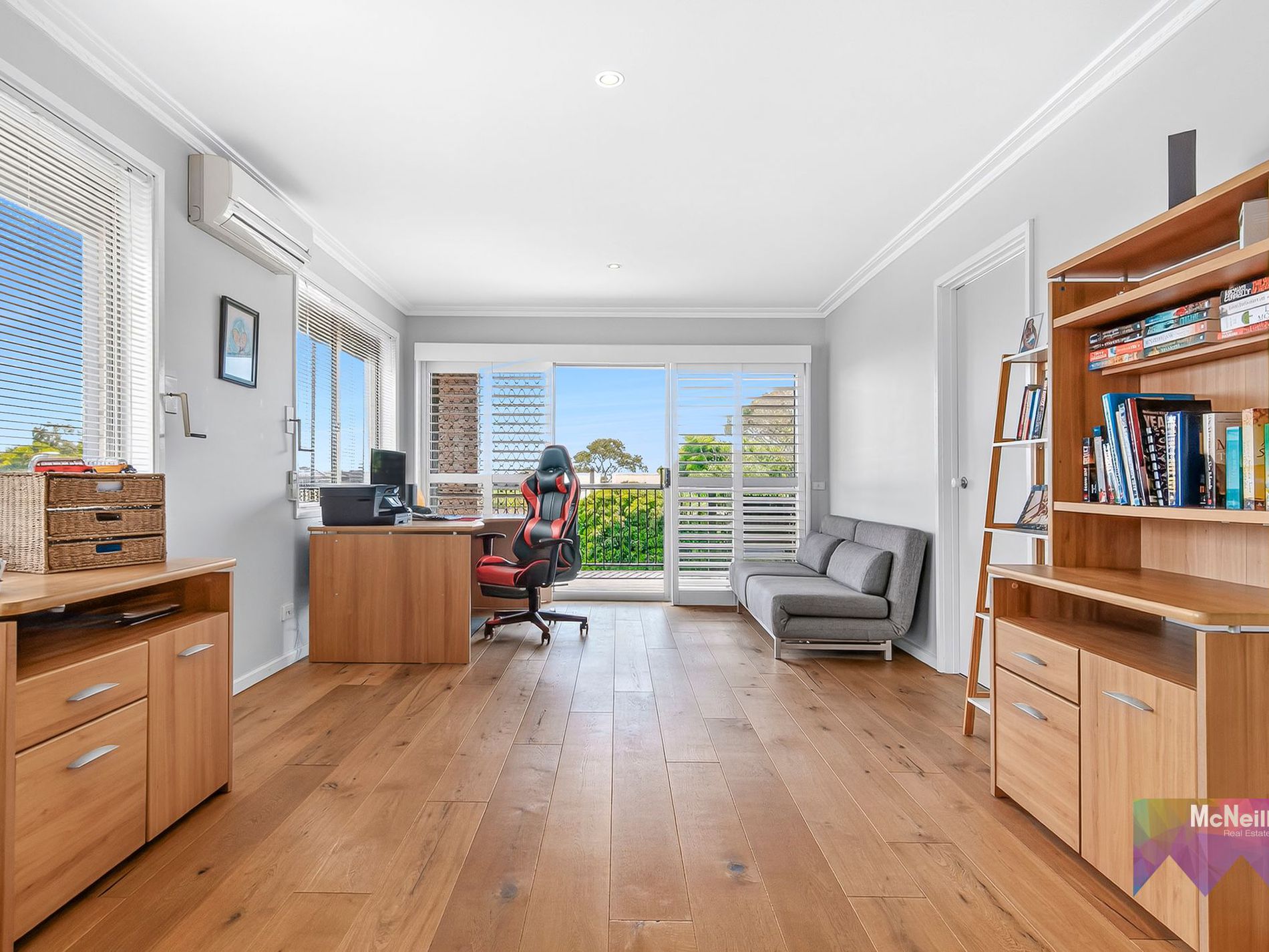 Upstairs, parents get a genuine retreat. A separate living room frames Bay glimpses; the north-facing balcony is where morning coffee turns into “let’s stay a bit longer.” The main suite is generous, with walk-in robe and ensuite—wake to light and outlook, not to-do lists. A fourth bedroom on this level includes its own walk-in robe and a neat study nook.