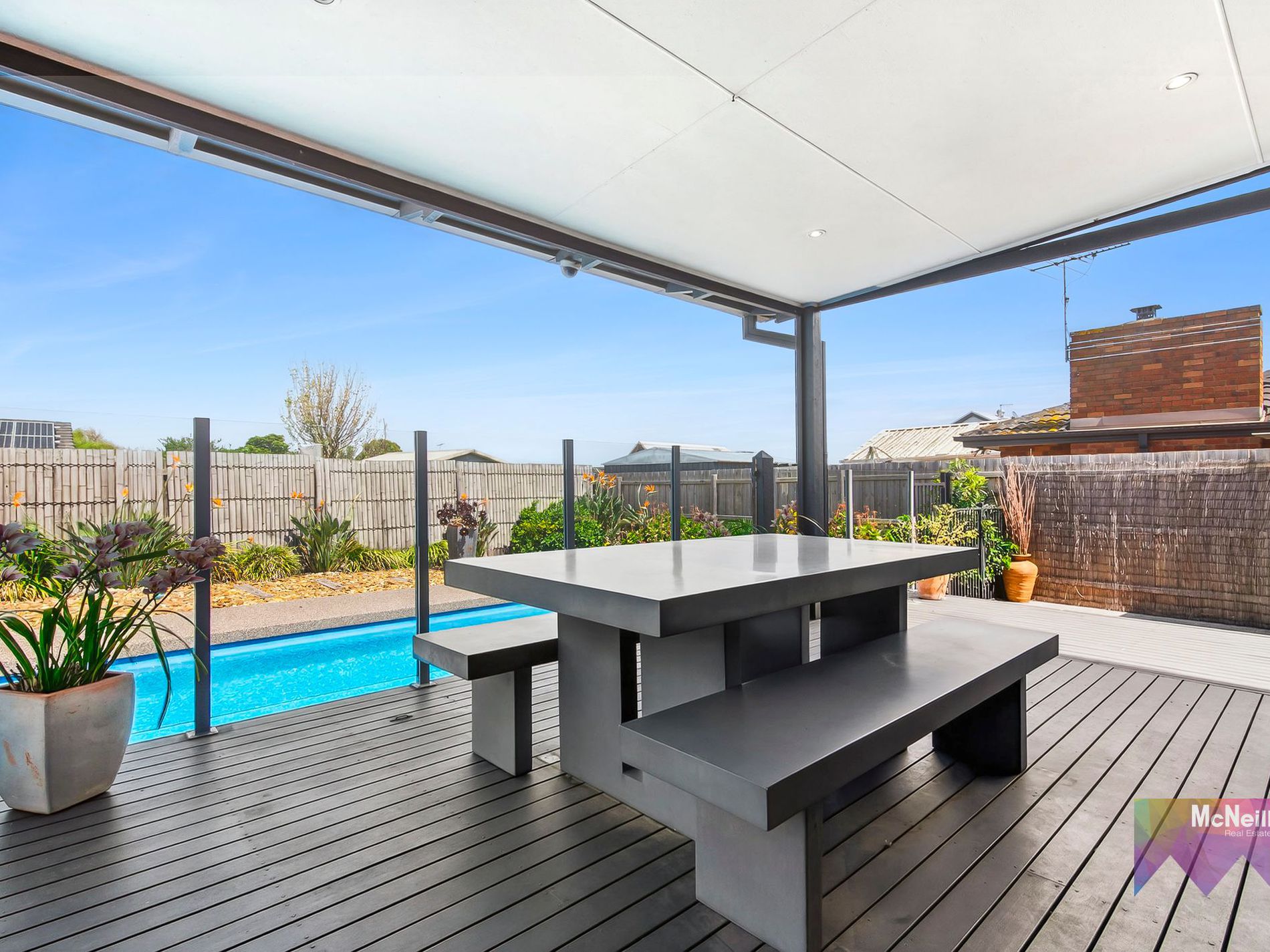 Two ground-floor bedrooms look over the sparkling, salt-chlorinated, heated pool—kids can play while dinner’s on, and summer afternoons roll into twilight swims. There’s a covered alfresco area too, so the outdoors works year-round.