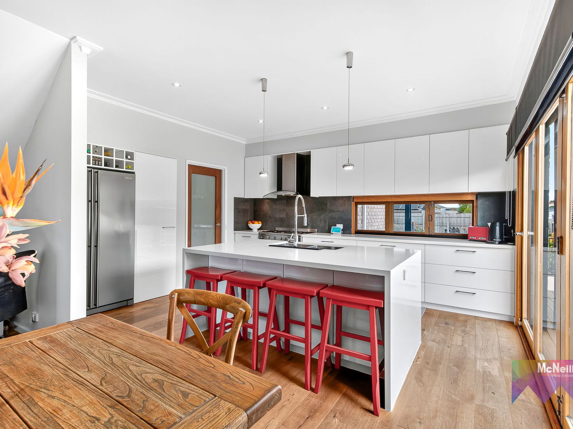 The kitchen is the heart of the home: waterfall stone benchtops, quality appliances and a handy servery to outside. Stacker doors slide open to a decked side garden, so cooking, chatting and entertaining all flow together.